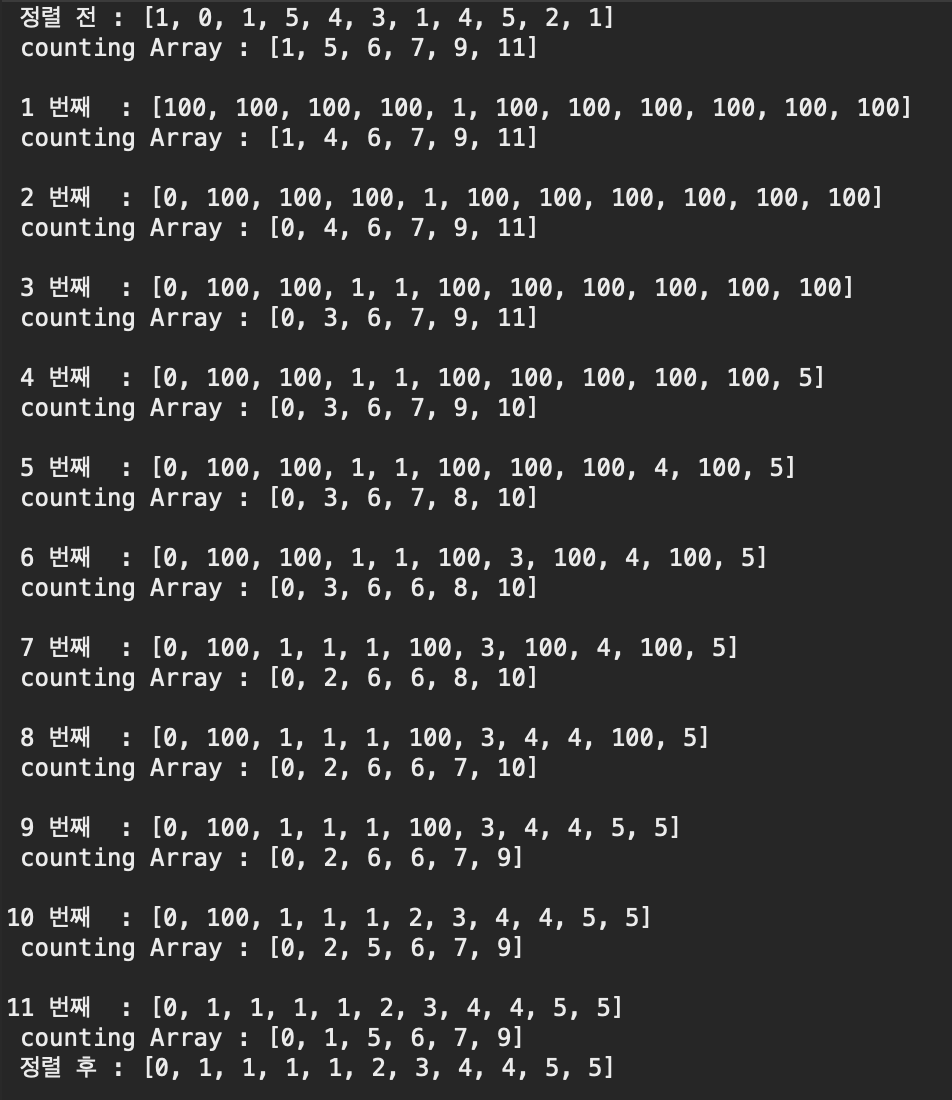 1. 먼저 배열 내에 원소 값들의 갯수를 저장하는 카운팅 배열 (Counting Array) 를 만든다.