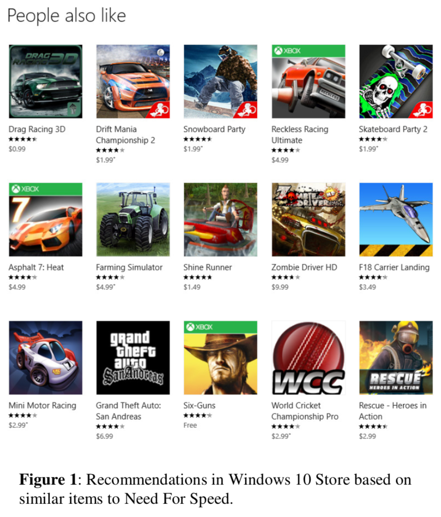 - 예를 들어 윈도우 10 앱 스토어에서, 각 앱이나 게임의 세부 정보 페이지에는 "People also like" 라는 제목의 유사한 다른 앱들의 리스트가 포함되어 있음.