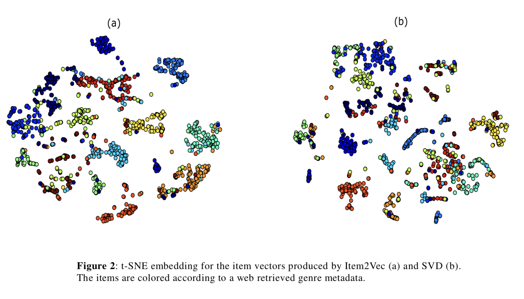 - Figures 2 (a) 와 2 (b) 는 각각 Item2Vec과 SVD에 대해 t-SNE에 의해 만들어진 2차원 임베딩을 표현함.