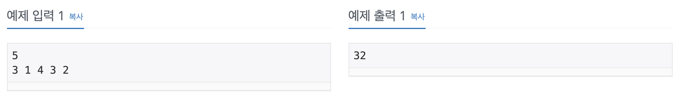 - 첫째 줄에 사람의 수 N (1 ≤ N ≤ 1,000)이 주어진다. 둘째 줄에는 각 사람이 돈을 인출하는데 걸리는 시간 \(P_{i}\)가 주어진다. (1 ≤ \(P_{i}\) ≤ 1,000)