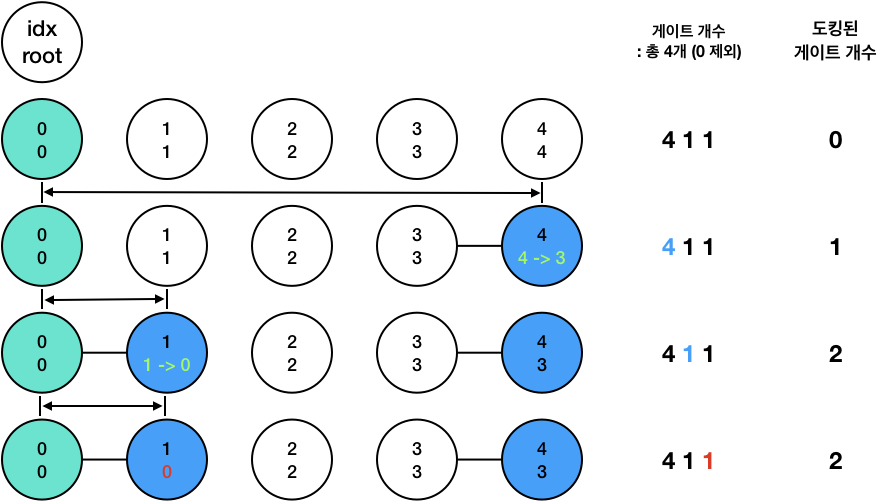 - 현재 도킹할 수 있는 게이트가 있다면, 현재 입력된 번호 게이트가 속한 루트 게이트를 찾고 루트 게이트 번호 보다 1 낮은 번호 (루트 게이트 번호 - 1) 게이트와 합집합 연산을 수행한다.