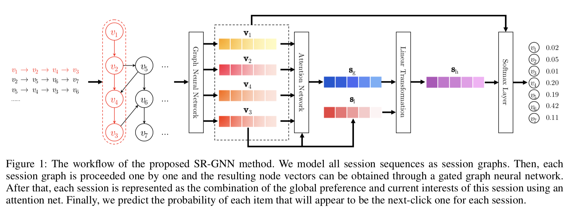 - 정확한 아이템 임베딩 벡터를 기반으로, 제시된 SR-GNN은 더 신뢰할 수 있는 세션 표현을 설계하고, 다음에 클릭될 아이템을 추론할 수 있음.