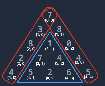 triangle[i][j] += Math.max(triangle[i - 1][j - 1], triangle[i - 1][j]);