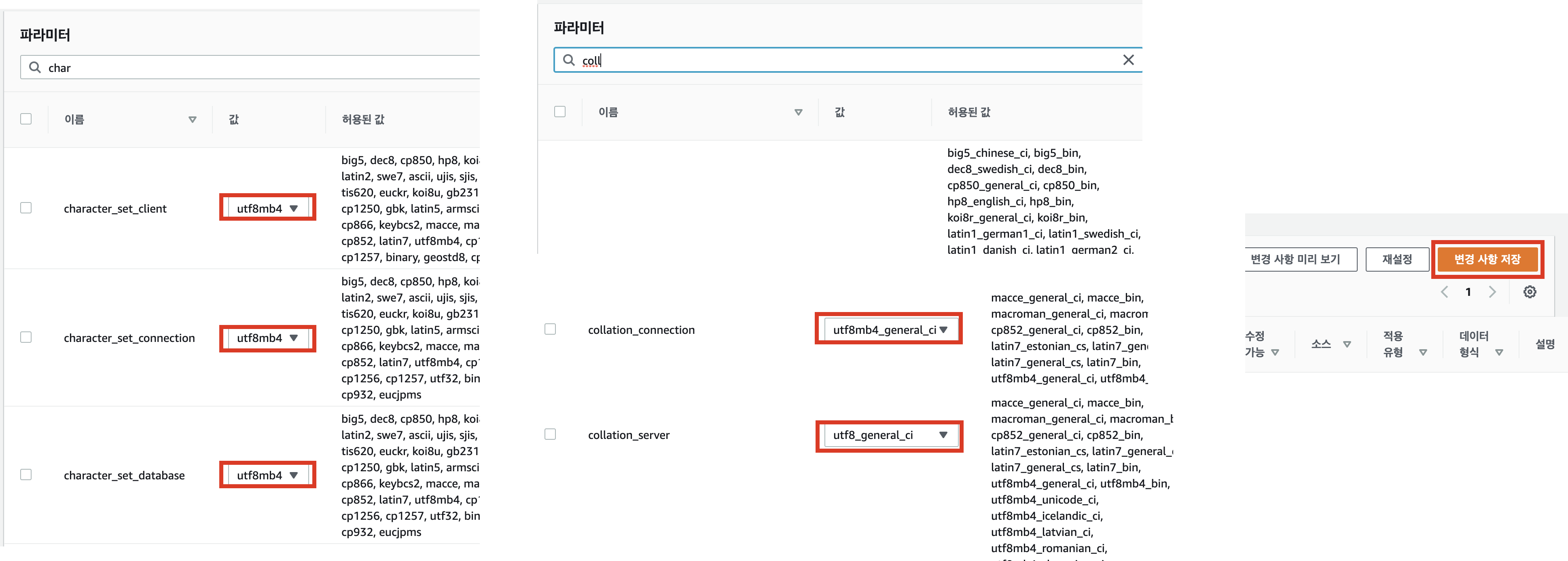 5. 아래 파라미터들을 찾아 각각 utf8mb4, utf8mb4_general_ci로 변경한다.
