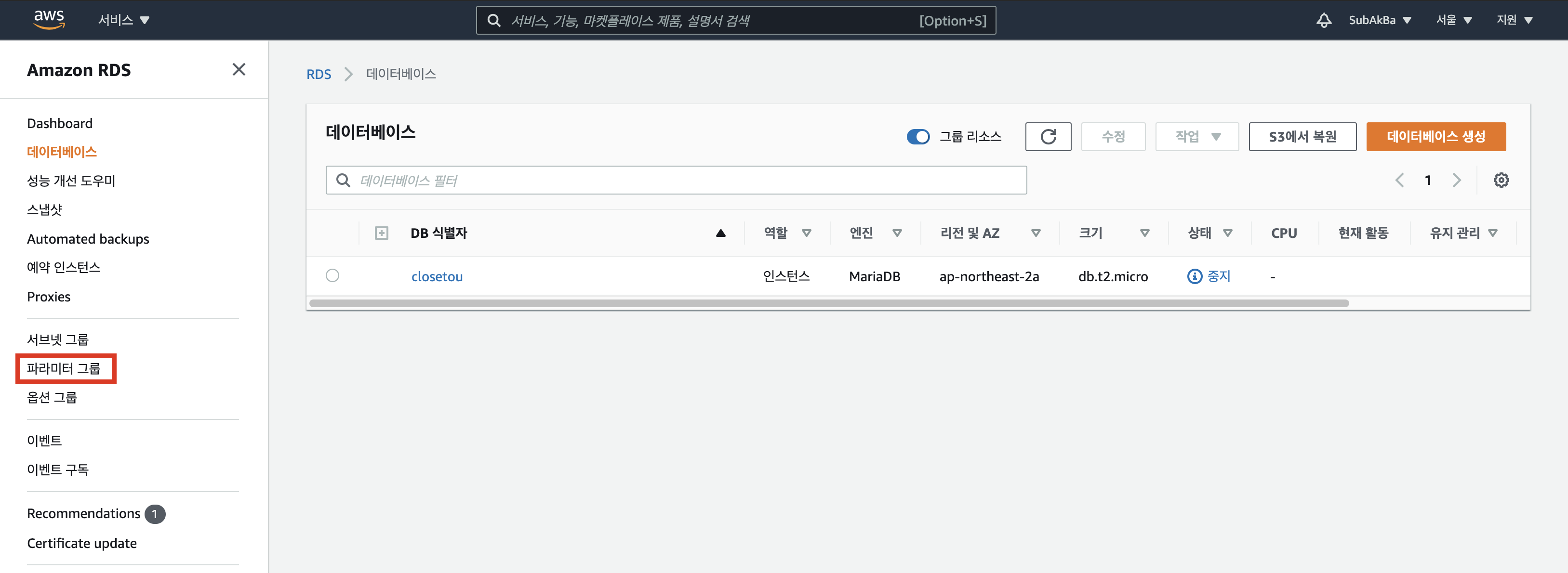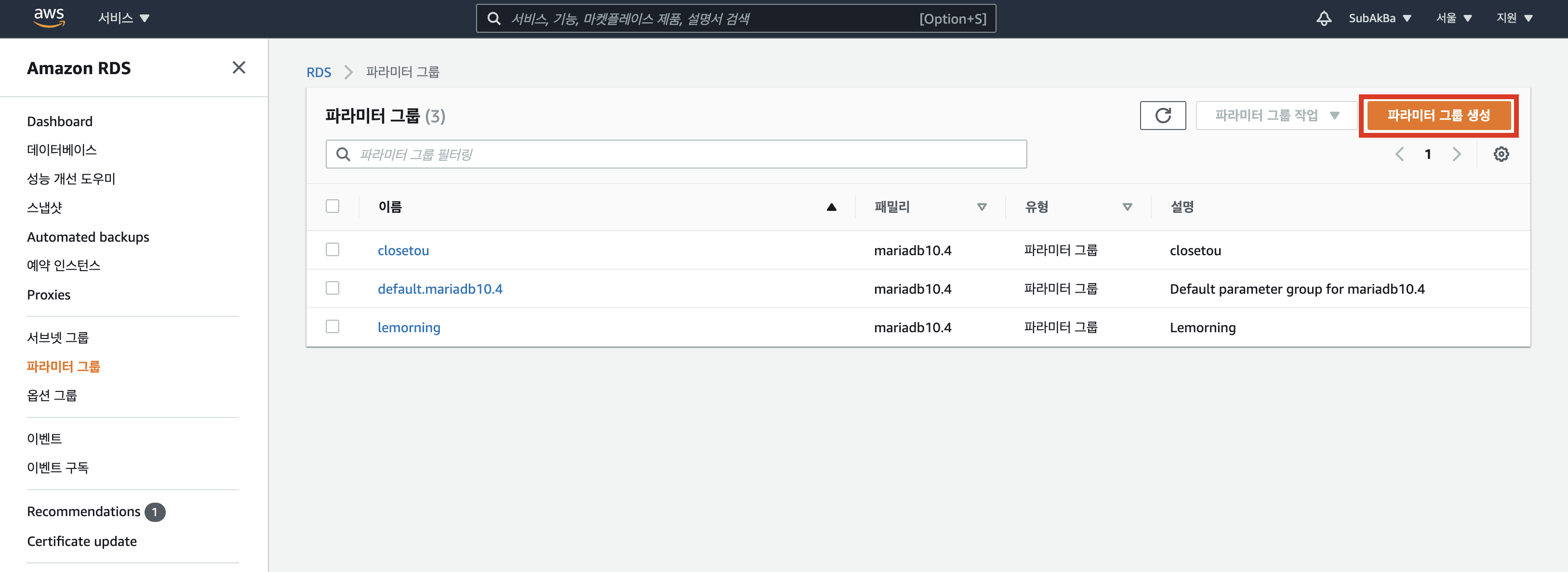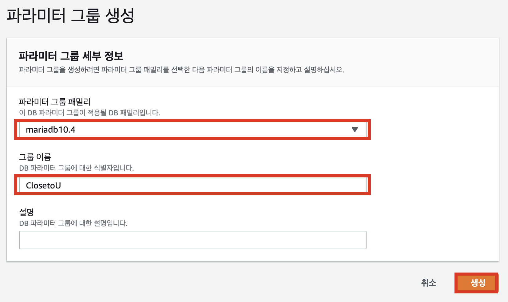 3. DB 종류 및 버전에 맞게 선택하고 그룹 이름 입력 후, 생성한다.