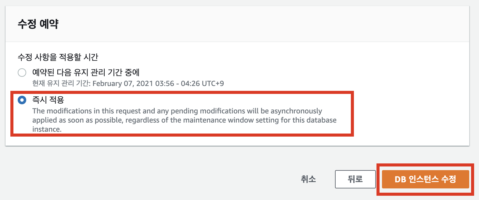8. 즉시 적용을 선택하고, DB 인스턴스 수정을 클릭한다.