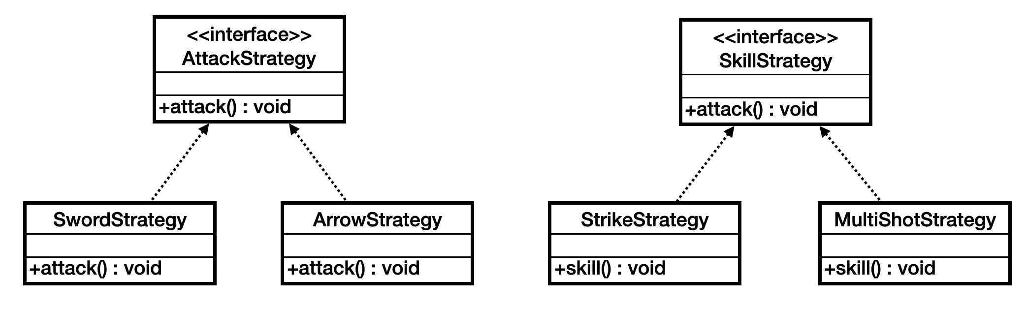 아래 그림의 AttackStrategy는 공격 방식을 캡슐화, SkillStrategy는 스킬을 캡슐화하는 인터페이스이다.