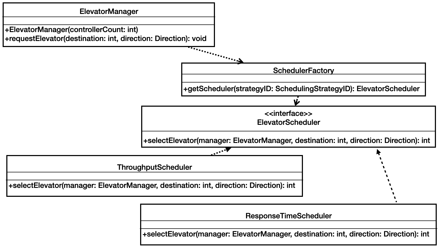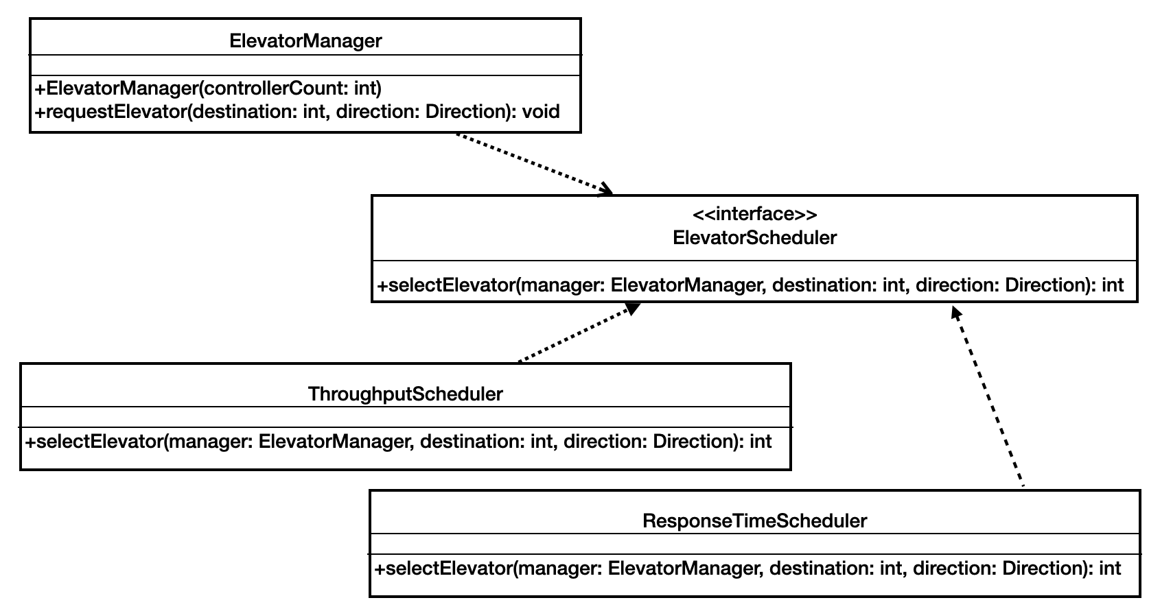 스트래티지 패턴을 사용하게 되면서 ElevatorManager 클래스는 ThroughputScheduler 또는 ResponseTimeScheduler 중 한 클래스를 동적으로 선택할 수 있게 되었다.
