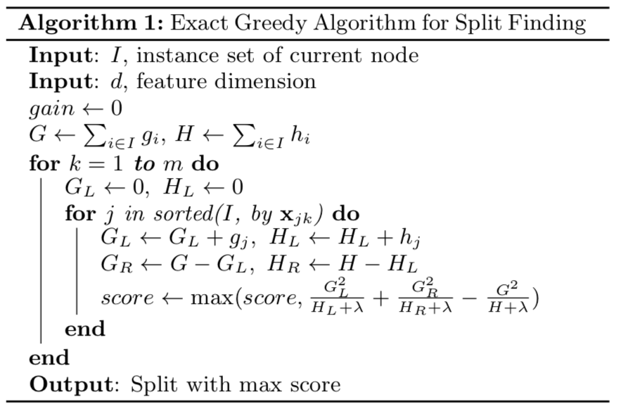 - 기존 단일 머신 부스팅 트리의 대부분에서는 이 알고리즘을 지원하며, Algorithm 1에서 설명함.