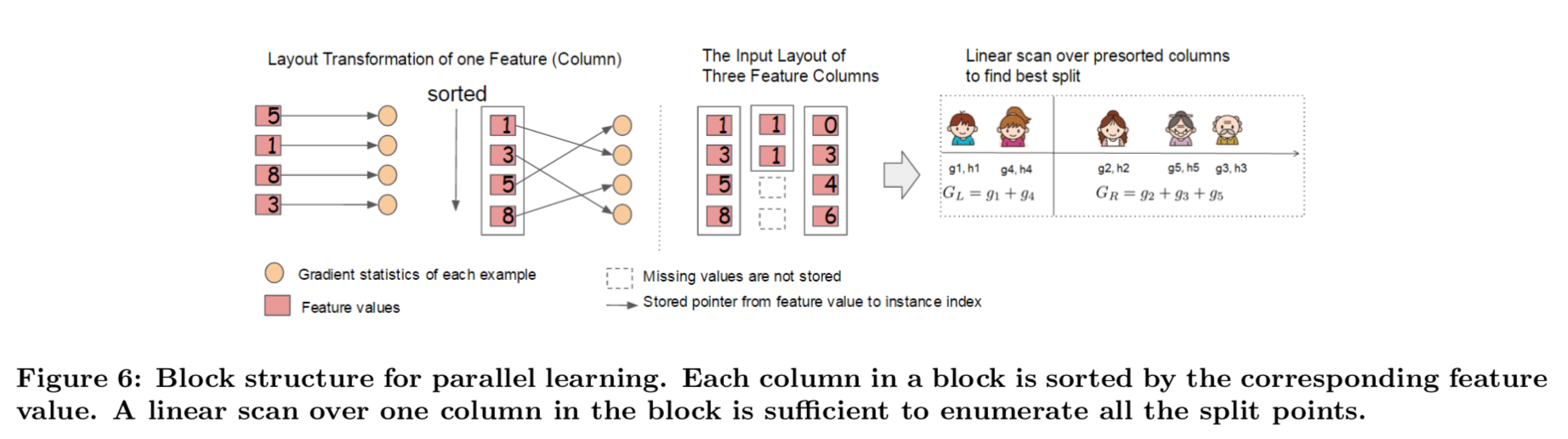 - 효율적으로 수행하기 위해, Feature 값에 따라 데이터를 정렬해야 하고, 수식 (7) 의 구조 점수에 대한 Gradient 통계량을 축적하기 위해 정렬된 순서에 따라 데이터를 찾아감.