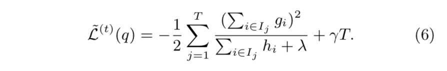 - 고정된 구조 (Structure) \(q(\mathbf{x})\) 의 경우, 다음과 같이 잎 \(j\) 의 최적의 가중치 \(w^{*}_{j}\) 를 계산할 수 있음 :