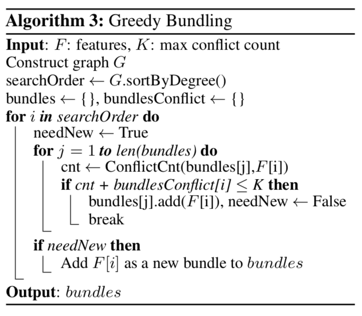 - 마지막으로, 정렬된 리스트에서 각 Feature를 확인하고, 작은 Conflict (\(\gamma\) 로 조절) 를 가진 기존 Bundle에 Feature를 할당하거나, 새로운 Bundle을 만듬.