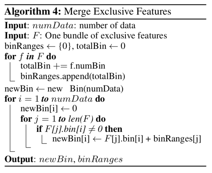 - 위 논의를 바탕으로, 우리는 Algorithm 3과 같이 배타적인 Feature Bundling에 대한 알고리즘을 설계함.