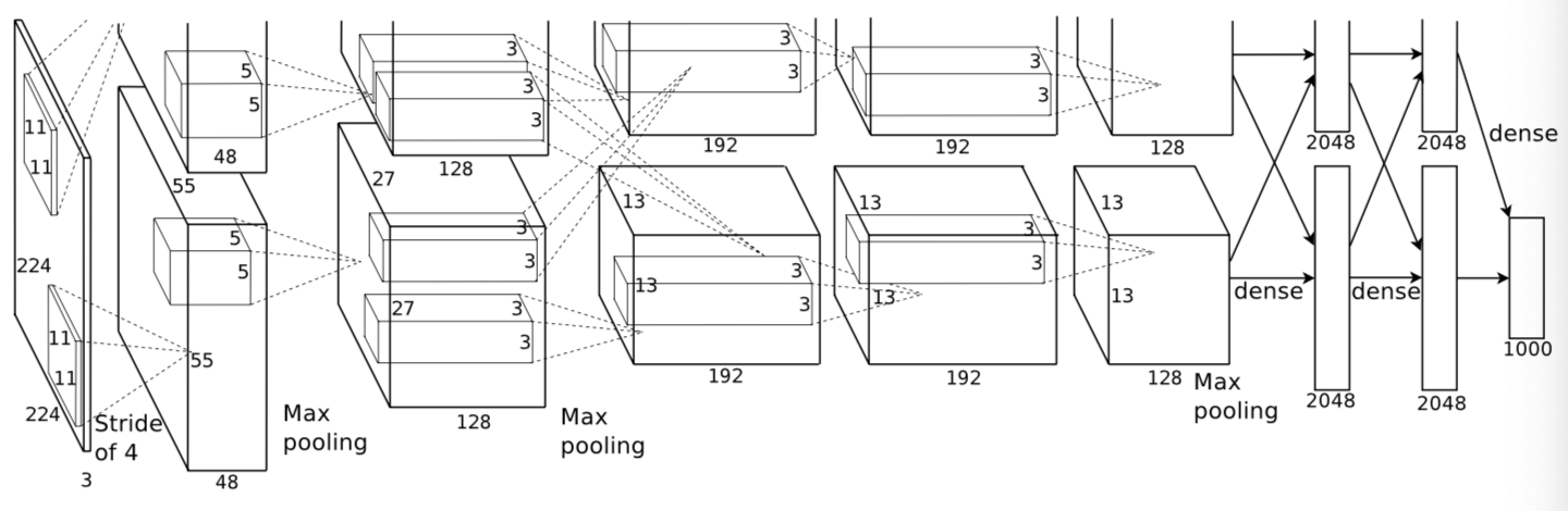 6000만개의 Parameter와 65만개 Neuron들을 가진 신경망은 5개의 Convolutional Layer, 3개의 Fully-Connected Layer로 구성되어 있으며, 마지막 층은 1000개의 category를 분류하기 위한 softmax함수가 있다.