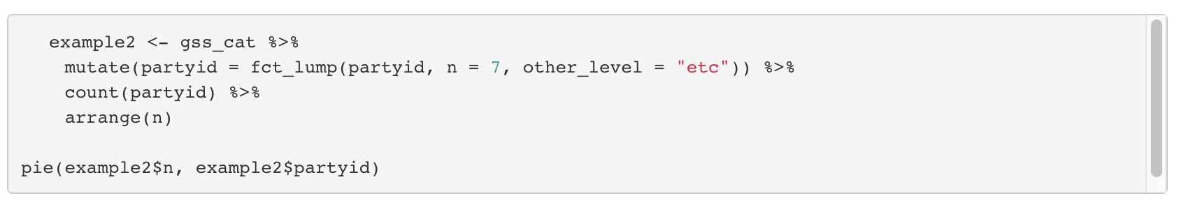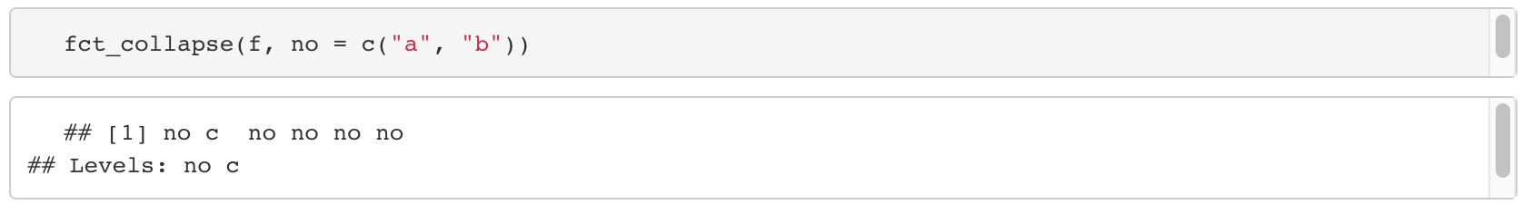 - fct_lump와 마찬가지로 levels를 합치는 기능을 제공하지만 사용하는 방법이 조금 다르다.