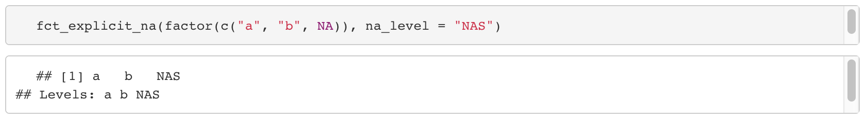 - Parameter na_level을 통해 원하는 문자열로 NA를 levels에 포함시킬 수 있다.