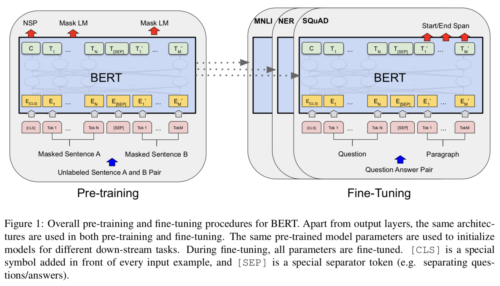 - MLM 이외에도, 공동으로 텍스트-Pair 표현을 Pre-training 하는 "Next Sentence Prediction" 작업도 사용함.