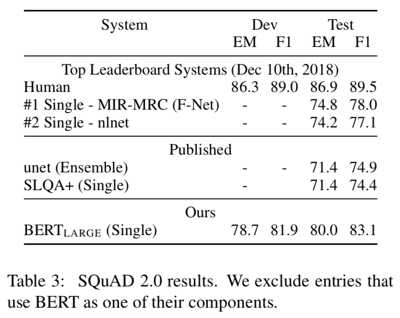 - SQuAD 2.0 과제는 제공된 Paragraph에 짧은 답이 존재하지 않을 가능성을 허용하여, 1.1 문제 정의를 확장하여 문제를 더 현실화시킴.
