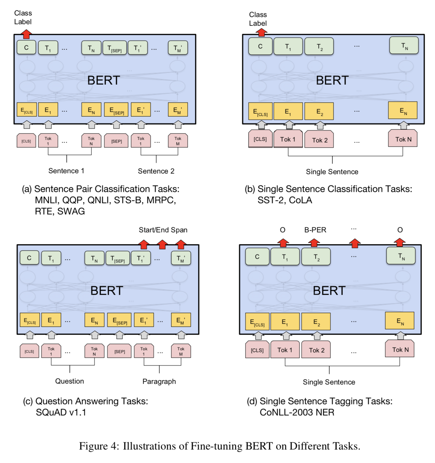 - 토큰 표현은 QA 또는 시퀀스 태깅 같은 토큰-수준 작업에 대한 Output 계층에 공급됨.