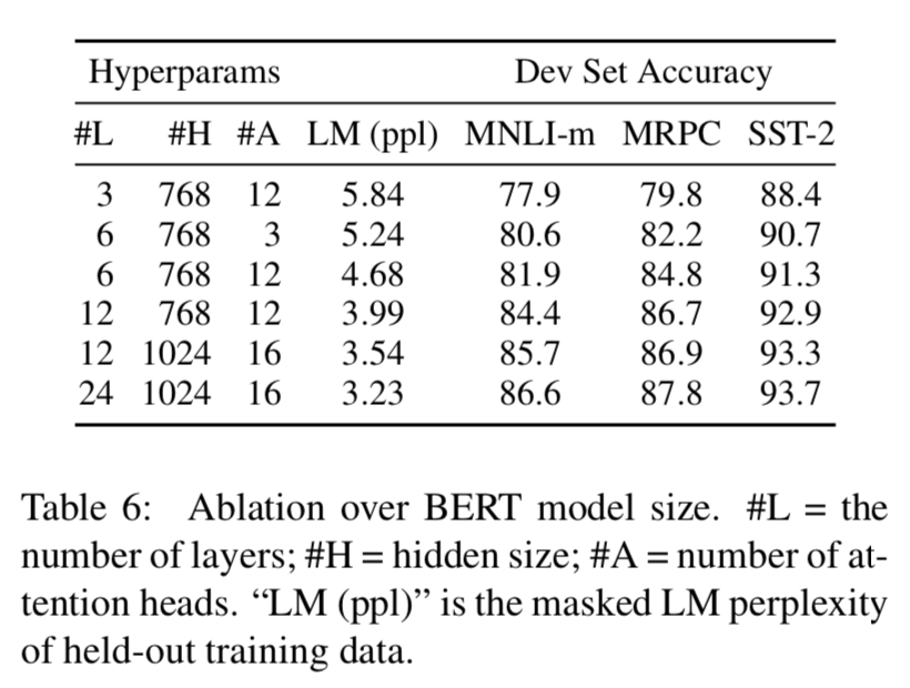 - \(\mathbf{BERT}_{\mathbf{BASE}}\) (L = 12, H = 768, A = 12, 총 파라미터 수 = 110M)
