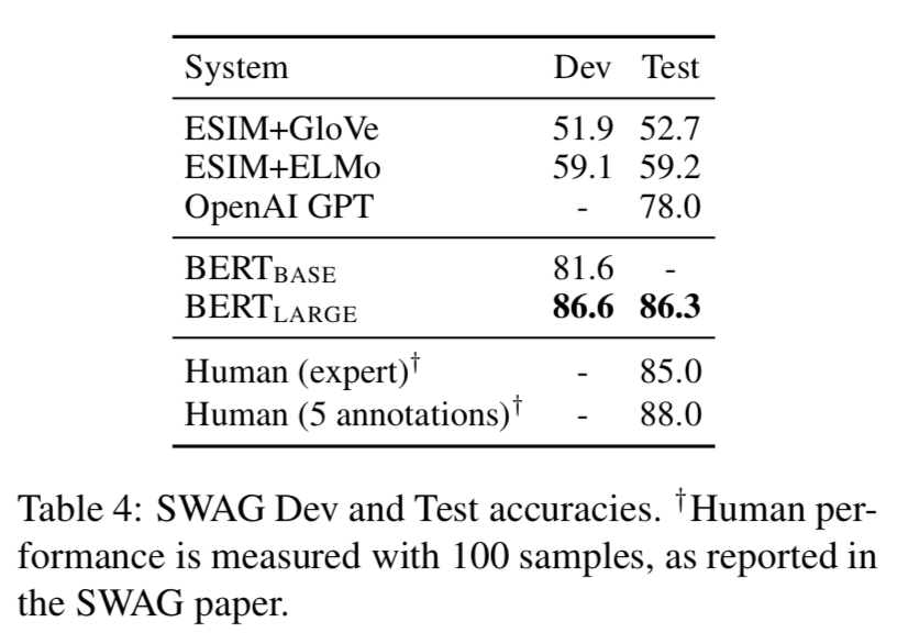 - SWAG (The Situations With Adversarial Generations) 데이터셋은 기초 상식 추론을 평가하는 문장 Pair Completion 예제를 포함함.