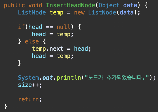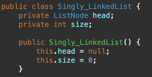 - 맨 처음인 head 노드와 리스트 크기를 클래스 변수로 넣어준다.