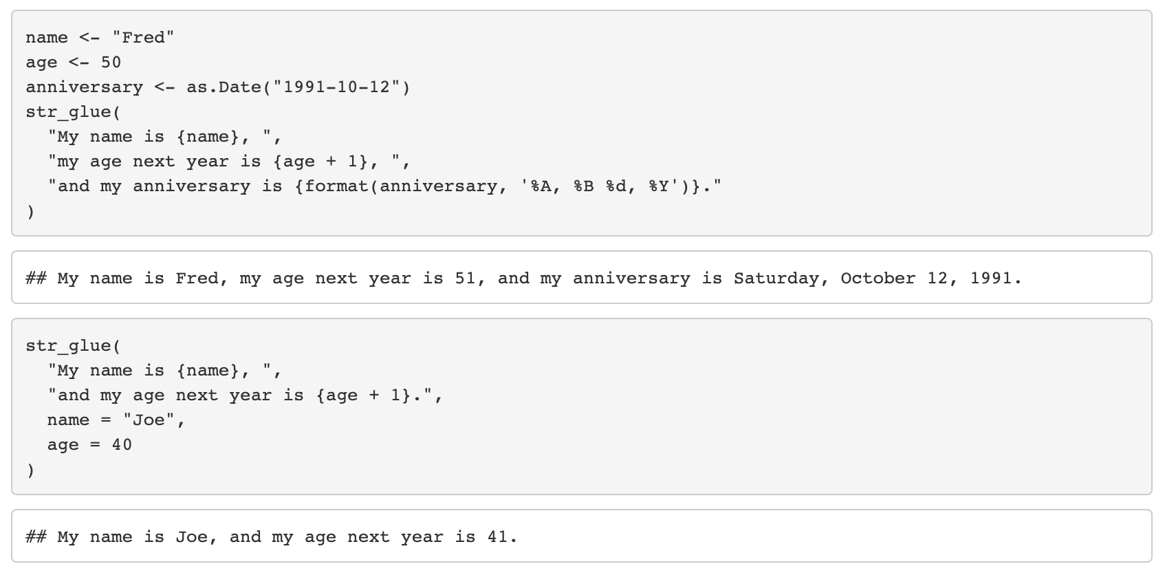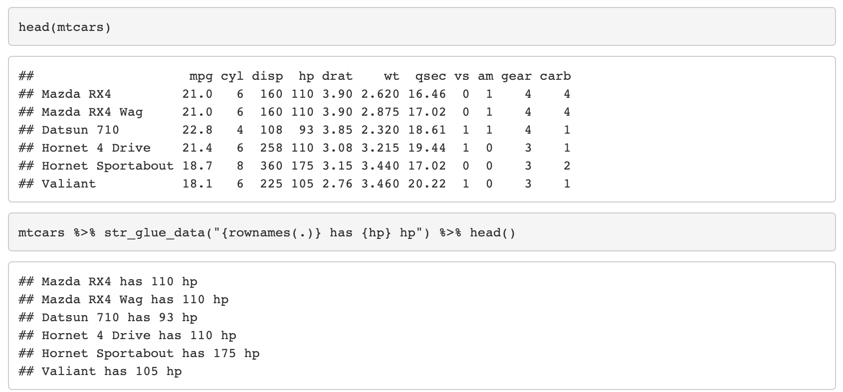 - str_glue_data는 예시 데이터를 사용하여 문자열에 덧붙인다.