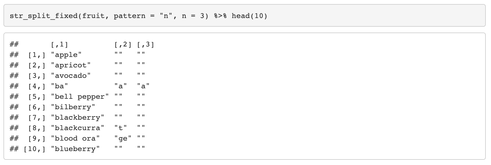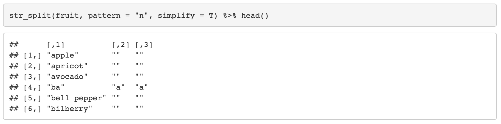 - str_split_fixed와 비슷한 함수이며, 동일하게 작동하지만 반환형이 다르다.