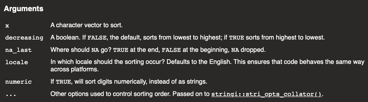 22. str_sort(x, decreasing = F, na.last = T, locale = "en", numeric = F, ...)