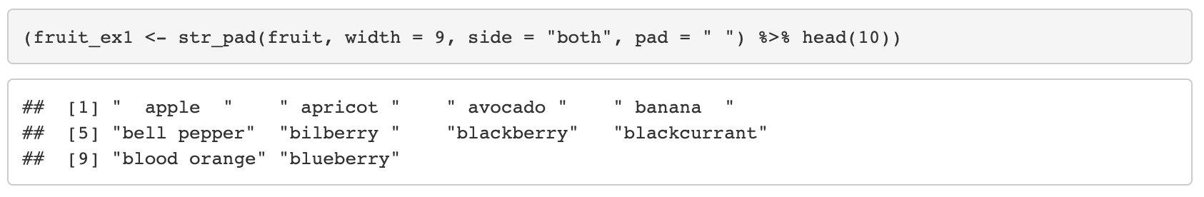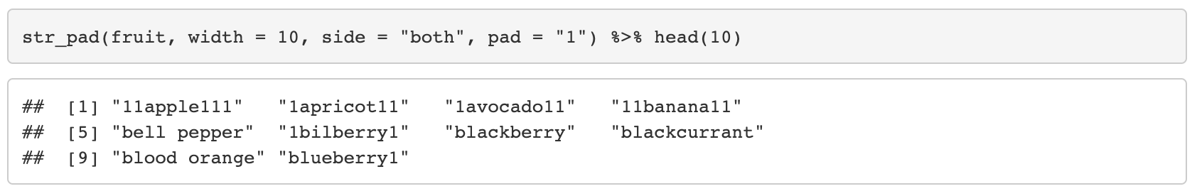 10. str_pad(string, width, side = c("left", "right", "both"), pad = " ")