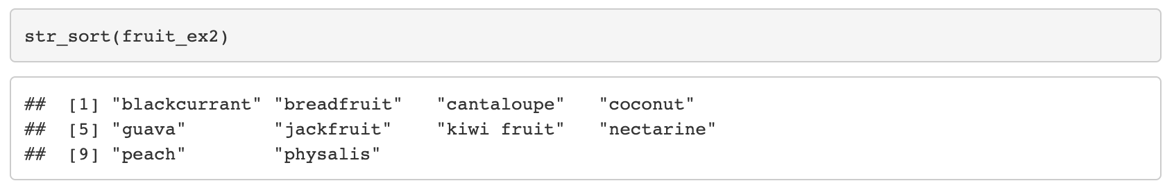 - str_order는 정렬된 문자열의 index를 반환한다면, str_sort는 정렬된 문자열 vector를 반환한다.