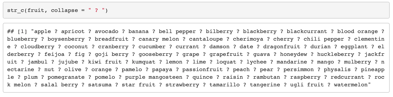 - collapse는 vector내 데이터들을 모두 묶어 하나의 문자열로 만들 때 연결해주는 문자열이다.