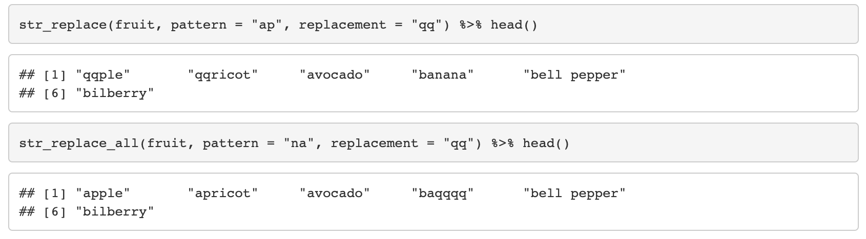 - str_replace는 첫 번째로 찾아낸 pattern만 대체하지만 _all은 모든 pattern을 찾아 대체한다.