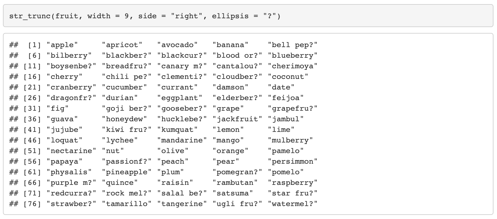 11. str_trunc(string, width, side = c("left", "right", "center"), ellipsis = "...")