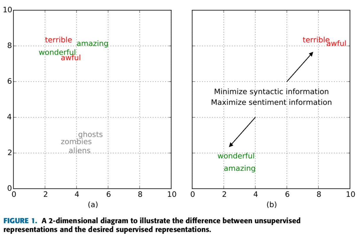 - 그러나, 선호하는 작업이 감성 분류 같은 지도 작업이라면, Figure 1 (b) 의 공간 내 다른 위치에 "amazing"과 "awful"과 같이 다른 극성을 가지고 있는 단어들을 분리하고 싶을 것임.