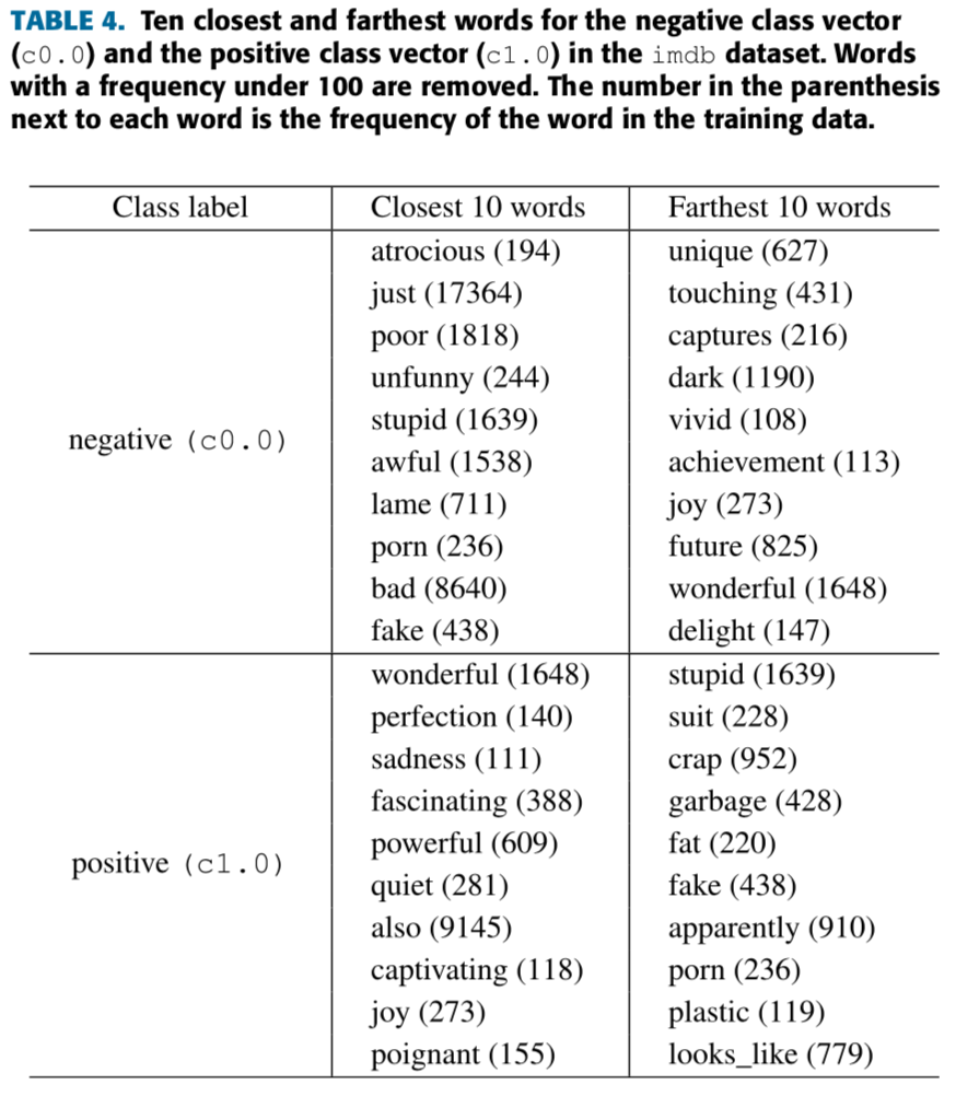 - Table 4는 각 Positive, Negative 감성을 가진 단어들이 그 클래스 레이블과 더 가깝다는 것을 보여줌.