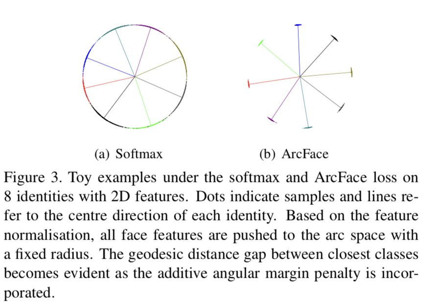 - ArcFace는 정규화된 Hypersphere에서 호 (Arc) 와 각도 (Angle) 사이의 정확한 일치성 덕분에 직접 Geodesic Distance Margin을 최적화함.