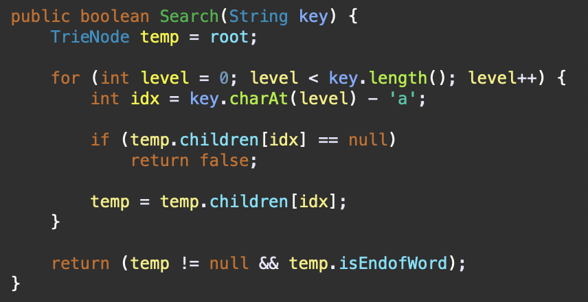 - Insert함수와 마찬가지로 문자열 길이만큼 비교하면서 노드가 없다면 (temp.children[idx] == null) 탐색하려는 노드가 없다는 것이므로 false를 반환한다.