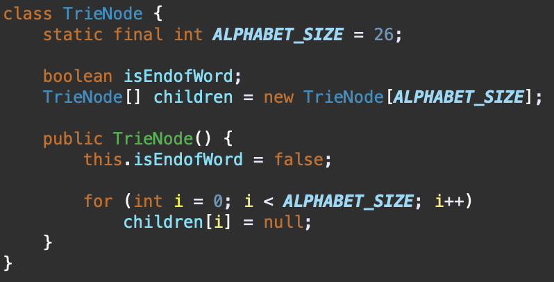 - isEndofWord는 노드가 터미널 노드인지 (문자열 끝부분) 여부를 확인하는 boolean 변수이다.