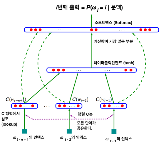 - NPLM은 n-gram 언어 모델과 마찬가지로 다음 단어를 예측하기 위해 이전의 모든 단어를 참고하는 것이 아닌, 정해진 n개의 단어만 참고한다.