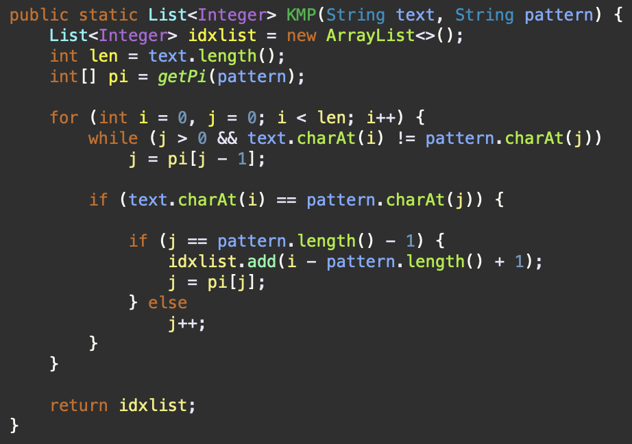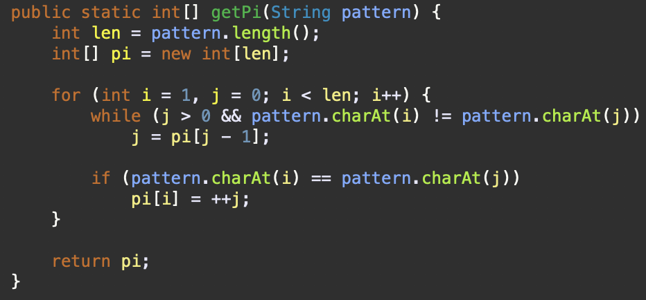 - 단, 차이점은 문자가 동일하고 j가 패턴의 끝부분인 경우, pi[j]의 값으로 j를 갱신한다는 것이다.