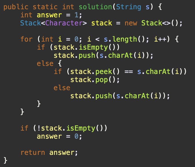 - 반복문이 종료된 이후에도 스택이 비어 있지 않다면, 성공적으로 수행하지 못하는 것이므로 answer = 0 으로 바꿔준다. (실패)