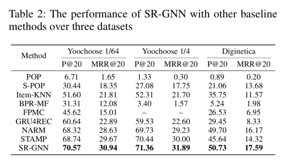 - 실제 데이터셋에서 실시한 대규모 실험에서는 SR-GNN이 명백하게 좋은 성능을 내는 것을 보여줌.