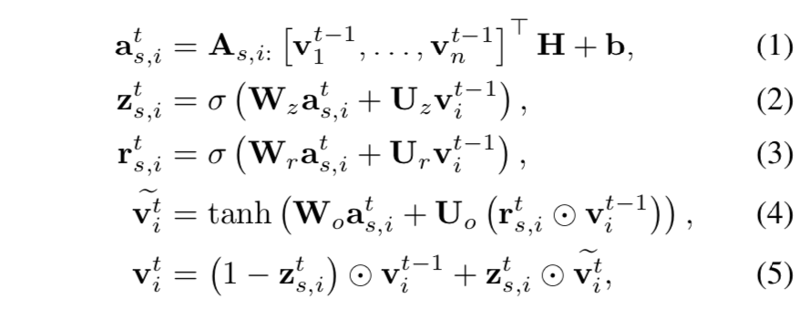 - 그런 다음, 각 세션 그래프는 연속적으로 진행되고, 각 그래프와 관련된 모든 노드의 잠재 벡터들은 Gated GNN을 통해 얻을 수 있음.