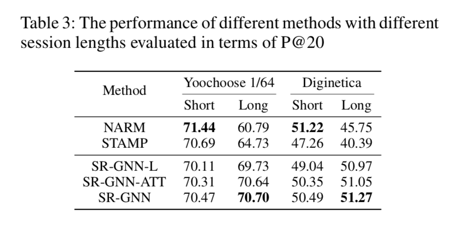 - 우리가 제시한 SR-GNN과 다른 형태 기법들은 서로 다른 세션 길이를 가진 두 가지 데이터셋에서 안정적으로 수행함.