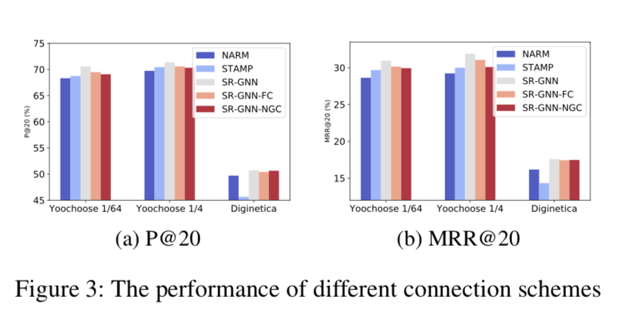 - 그림에서 보면, 세 연결 방식 모두 STAMP & NARM 기법 같은 최신 모델들보다 더 좋거나 거의 동일한 성능을 달성하며, 그래프로써 세션 모델링의 유용성을 확인할 수 있는 것으로 보임.