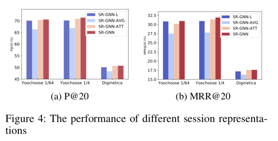 - 그런 다음, 우리는 서로 다른 세션 표현을 가지고 SR-GNN-L, SR-GNN-ATT, SR-GNN의 성능을 분석함.