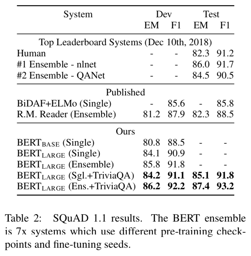 - SQuAD 2.0 과제는 제공된 Paragraph에 짧은 답이 존재하지 않을 가능성을 허용하여, 1.1 문제 정의를 확장하여 문제를 더 현실화시킴.
