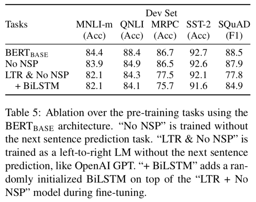 - 정확히 동일한 Pre-training 데이터, Fine-tuning Scheme, \(BERT_{BASE}\) 의 하이퍼파라미터를 사용하여, 두 개의 Pre-training Objectives를 평가함으로써 BERT의 심층 양방향의 중요성을 증명함.
