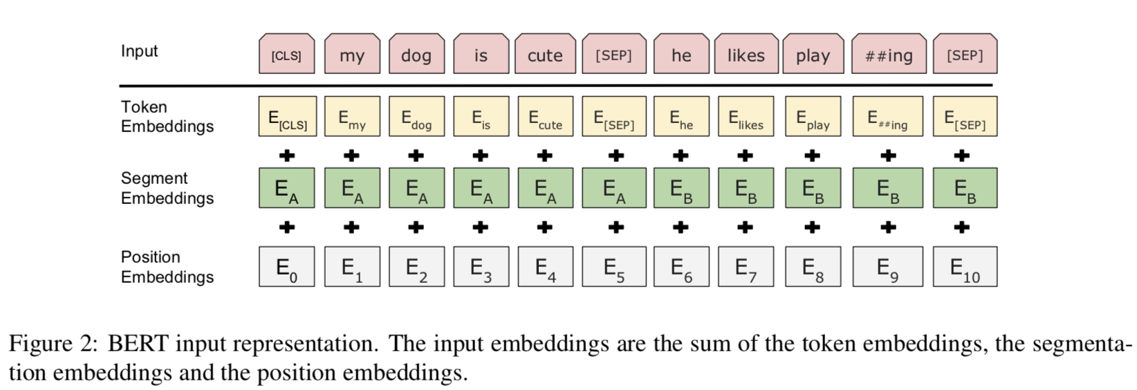 - 토큰이 주어지면, 토큰의 Input 표현은 해당하는 토큰, 세그먼트, 위치 임베딩을 합치면서 구축됨.